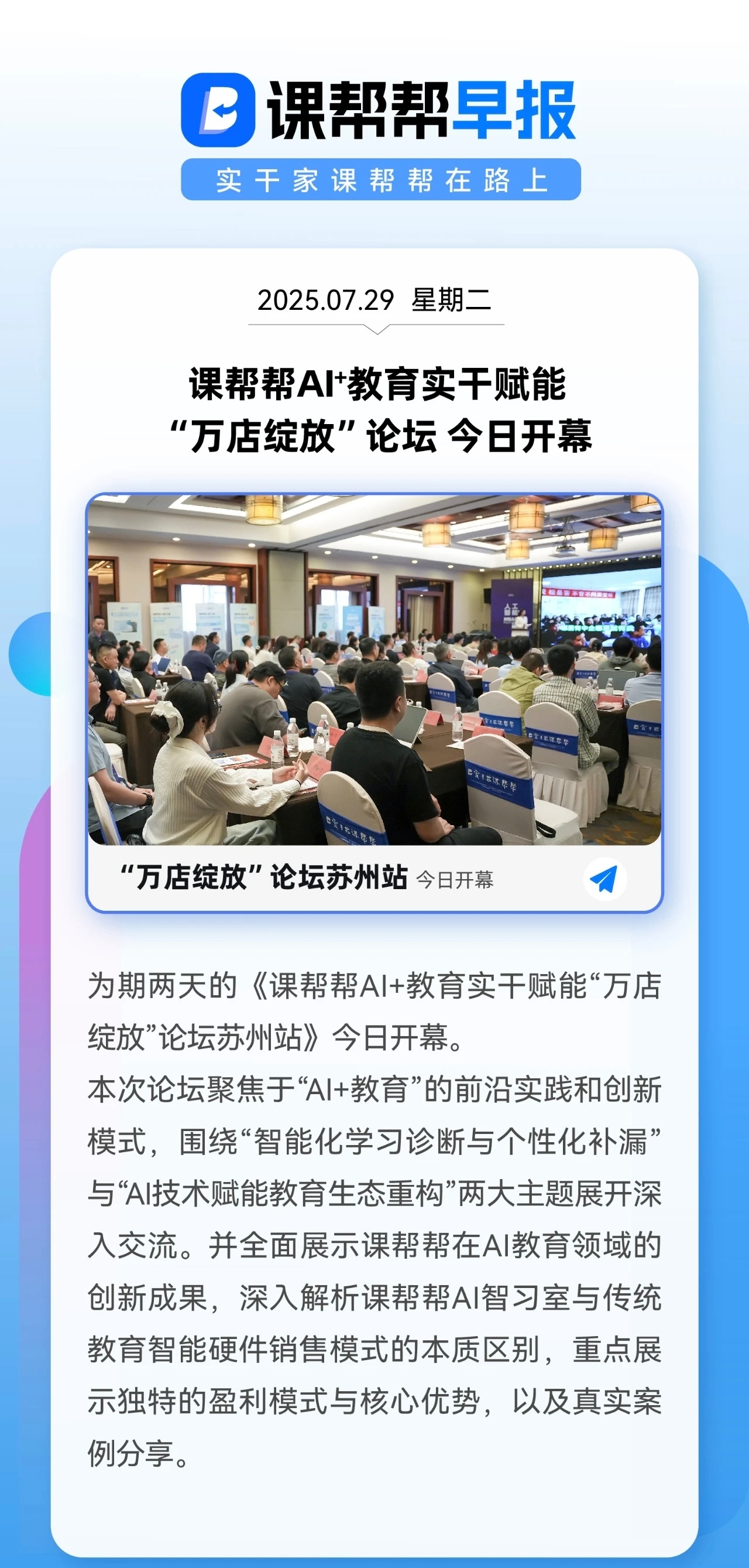 为期两天的《课帮帮AI+教育实干赋能“万店绽放”论坛苏州站》今日开幕。