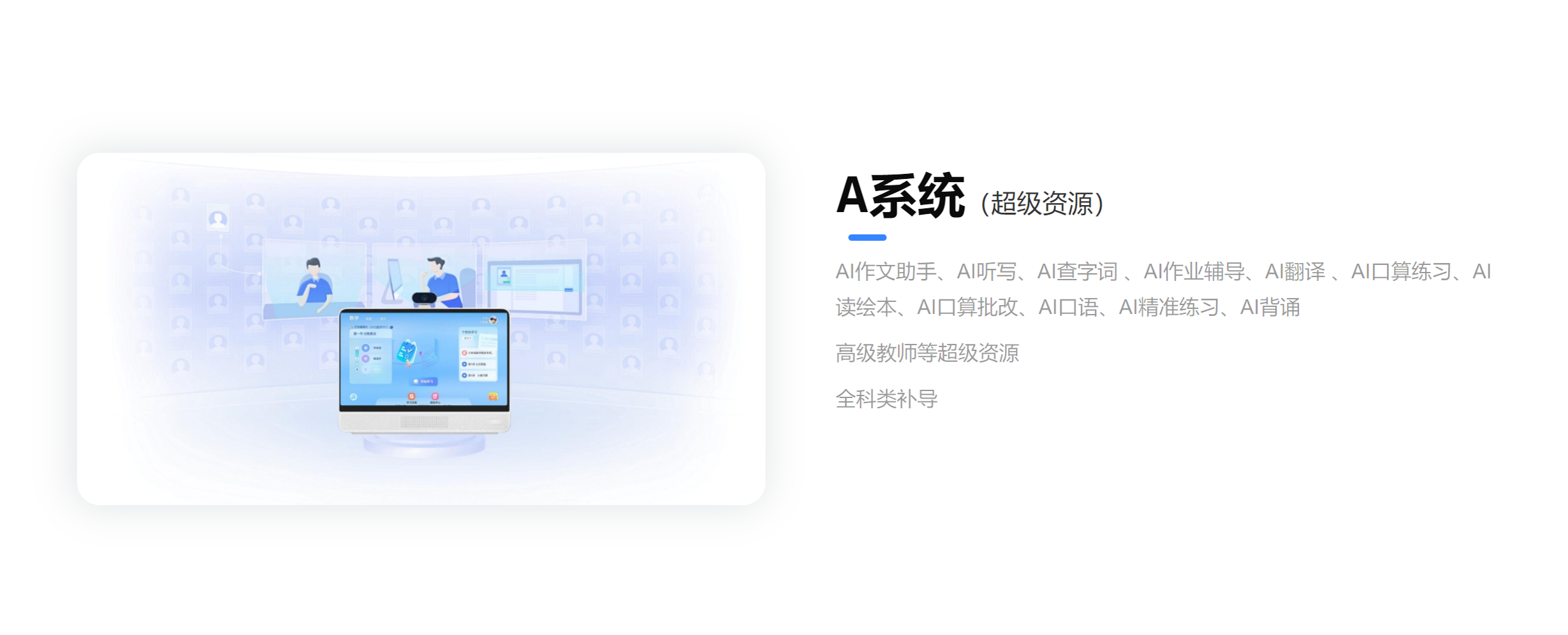 AI作文助手、AI听写、AI查字词、AI作业辅导、AI翻译、AI口算练习、AI读绘本、AI口算批改、AI口语、AI精准练习、AI背诵高级教师等超级资源全科类补导。