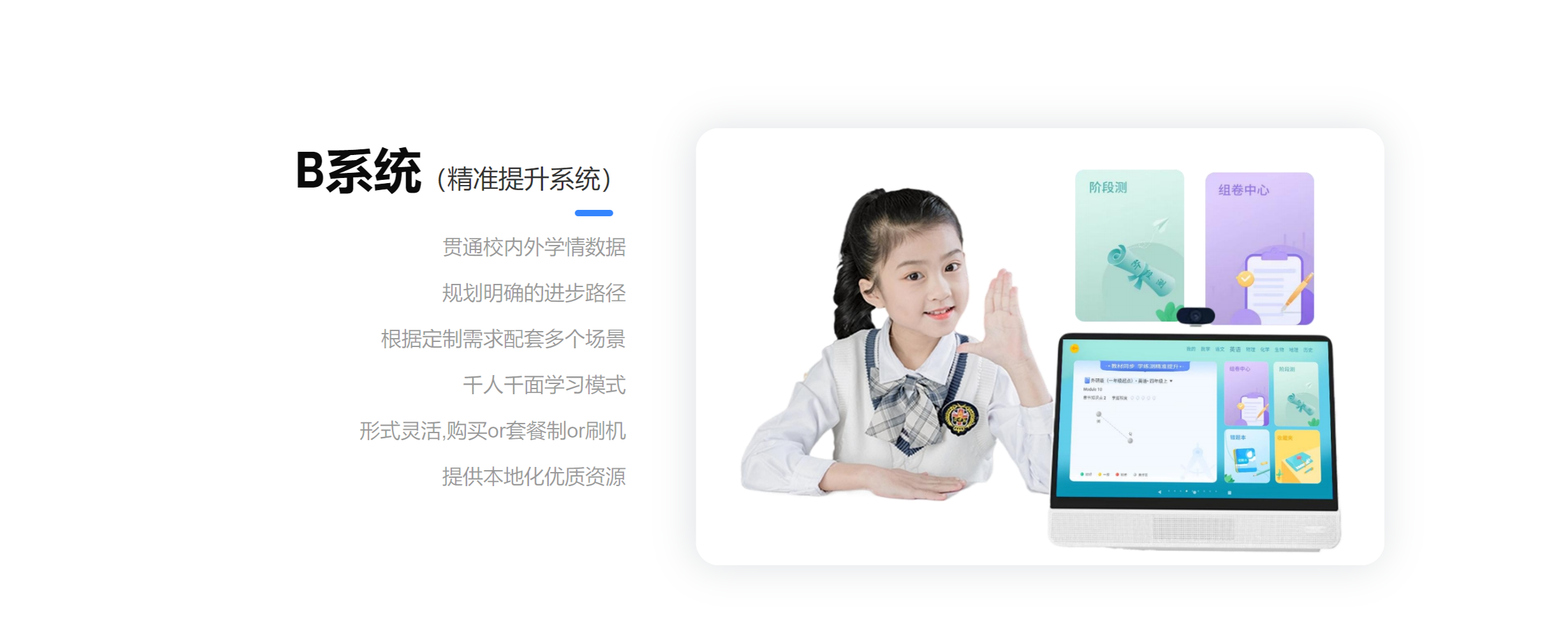 贯通校内外学情数据规划明确的进步路径根据定制需求配套多个场景,千人千面学习模式,形式灵活,购买or套餐制or刷机,提供本地化优质资源。