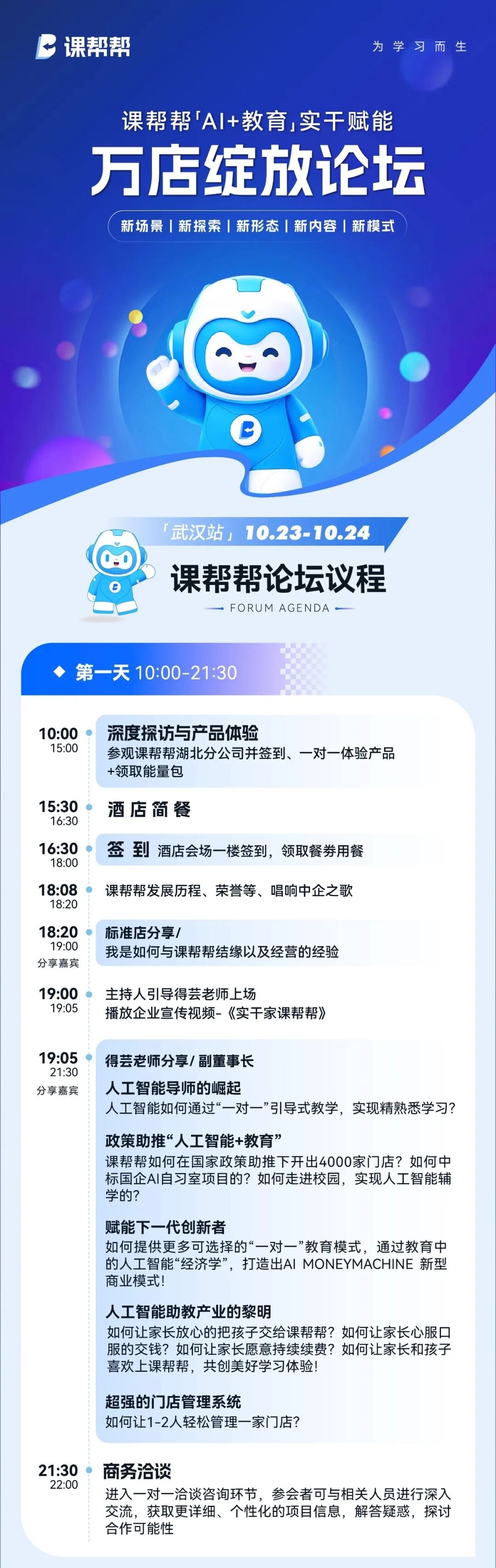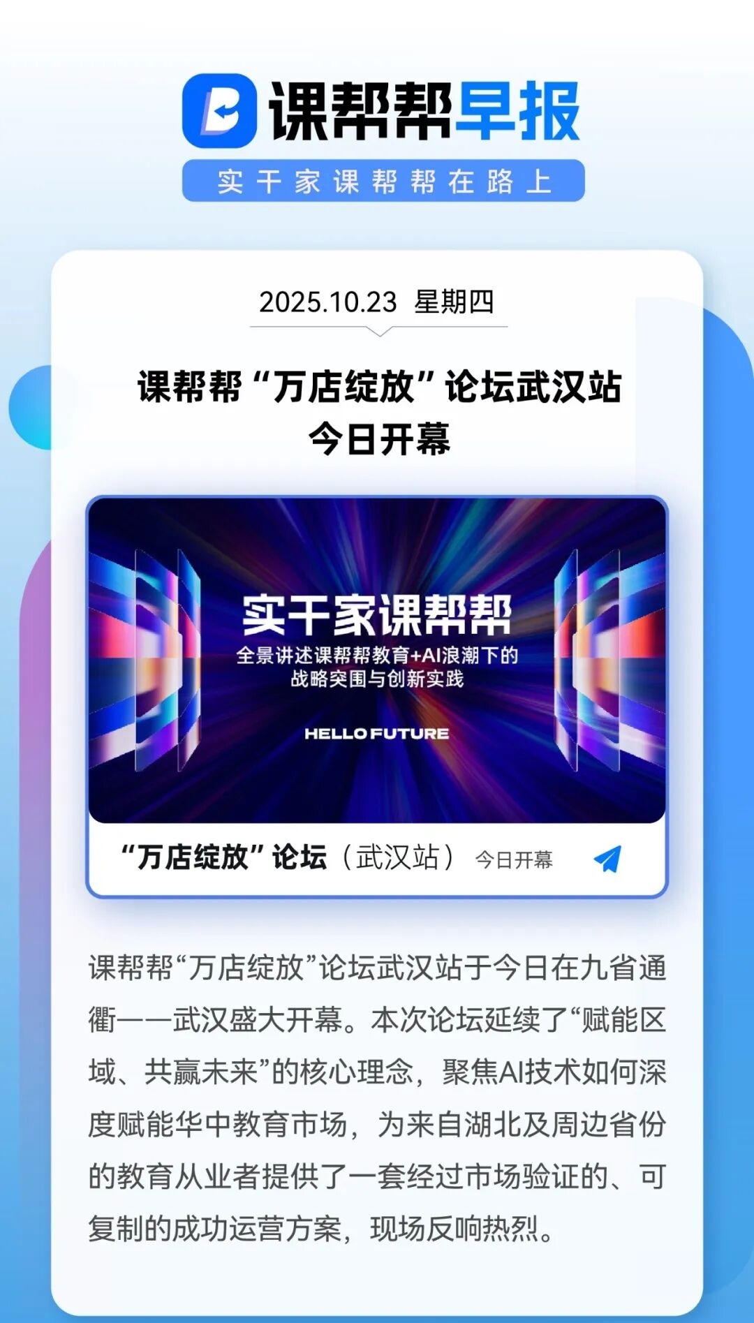 课帮帮“万店绽放”论坛武汉站于今日在九省通衢一一武汉盛大开幕。本次论坛延续了“赋能区域、共赢未来”的核心理念,聚焦AI技术如何深度赋能华中教育市场,为来自湖北及周边省份的教育从业者提供了一套经过市场验证的、可复制的成功运营方案,现场反响热烈。