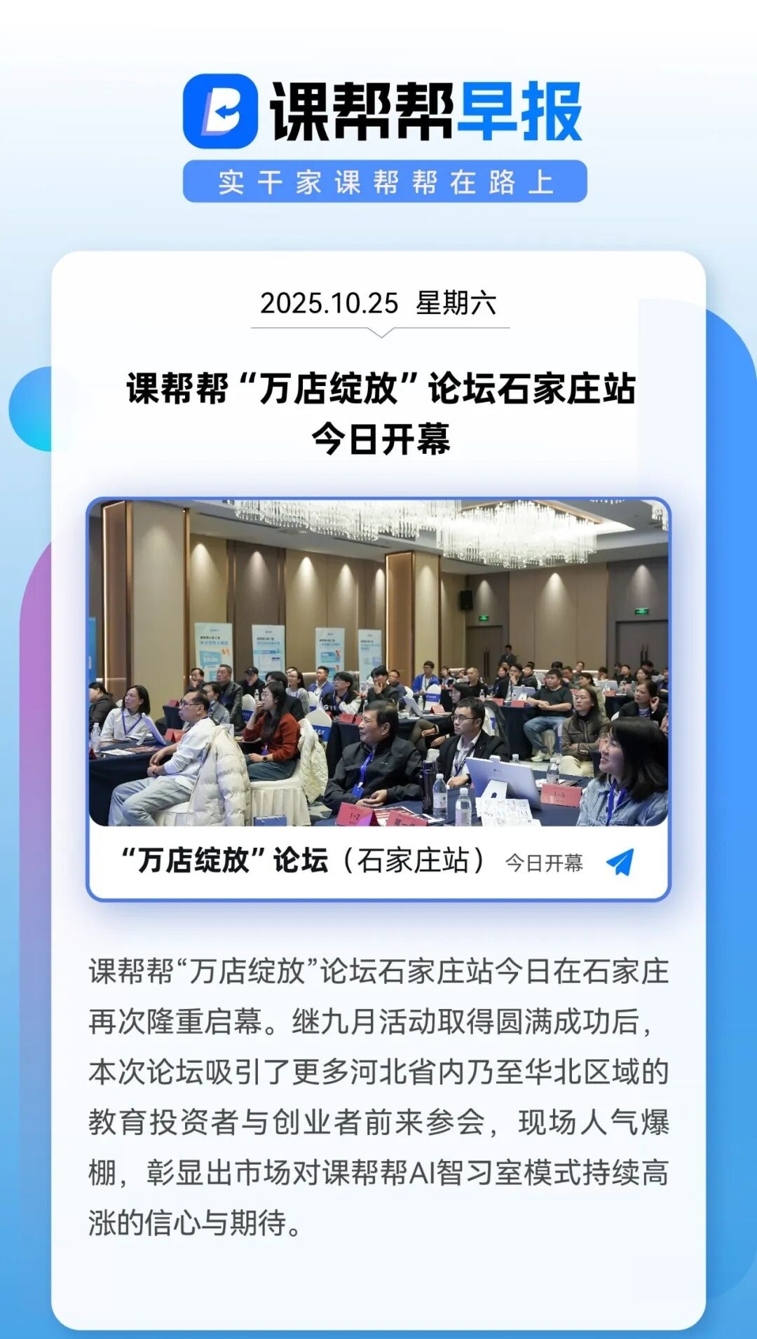 课帮帮“万店绽放”论坛石家庄站今日在石家庄再次隆重启幕。继九月活动取得圆满成功后,本次论坛吸引了更多河北省内乃至华北区域的教育投资者与创业者前来参会,现场人气爆棚,彰显出市场对课帮帮AI智习室模式持续高涨的信心与期待。