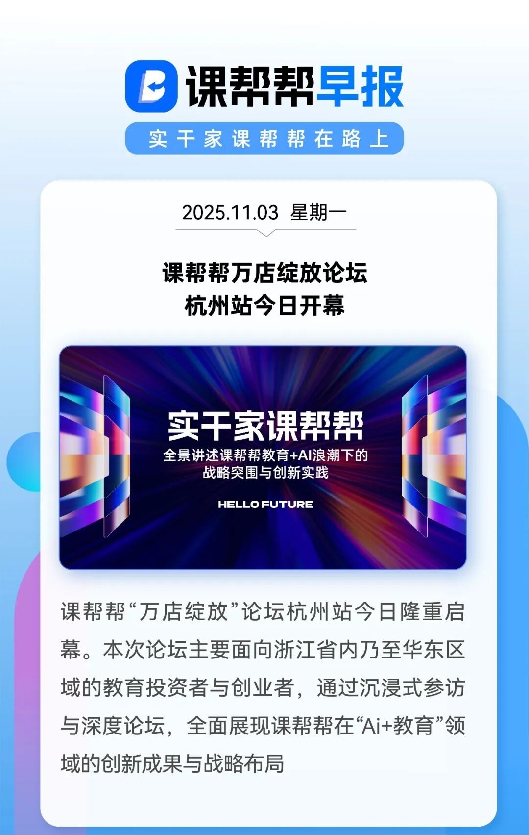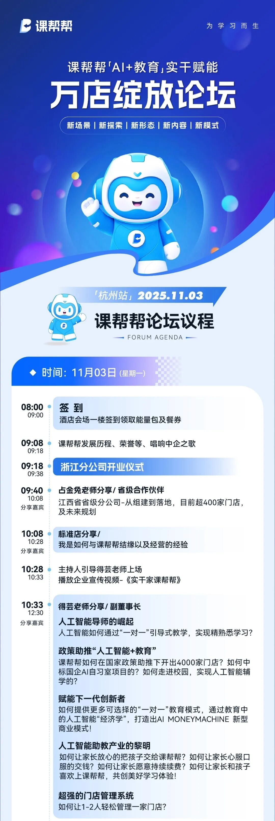 课帮帮“万店绽放”论坛杭州站今日隆重启幕。本次论坛主要面向浙江省内乃至华东区域的教育投资者与创业者,通过沉浸式参访与深度论坛,全面展现课帮帮在“Ai+教育”领域的创新成果与战略布局
