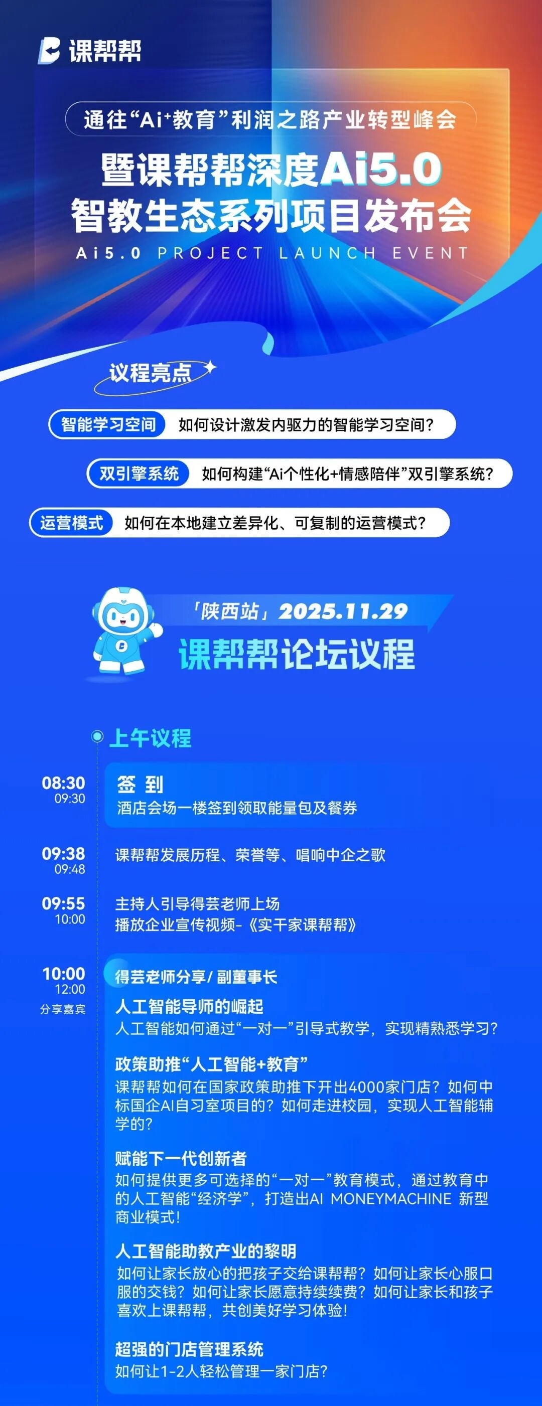 今日,通往“Ai+教育”利润之路产业转型峰会暨课帮帮深度Ai5.0智教生态系列项目发布会陕西站盛大开幕。本次论坛聚焦课帮帮Ai技术在教育领域的深度落地与规模化应用,通过嘉宾主题演讲、真实案例分享等环节,展示课帮帮独创的“数据驱动服务增值”商业模型,依托学习行为大数据构建的线上线下融合教育场景,为来自全国各地的教育从业者、投资者提供可复制、可运营的Ai教育解决方案
