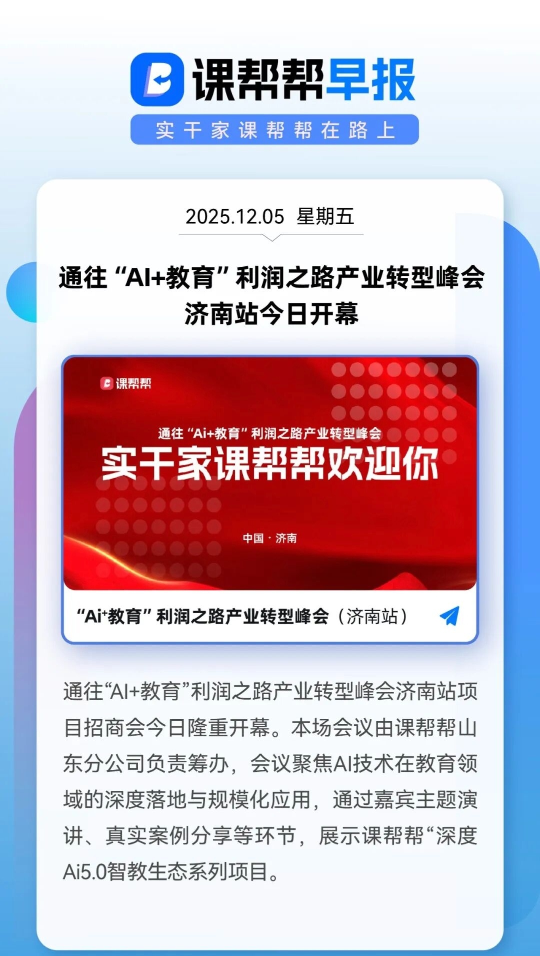 通往"AI+教育"利润之路产业转型峰会济南站项目招商会今日隆重开幕。本场会议由课帮帮山东分公司负责筹办,会议聚焦AI技术在教育领域的深度落地与规模化应用,通过嘉宾主题演讲,真实案例分享等环节,展示课帮帮"深度 Ai5.0智教生态系列项目。
