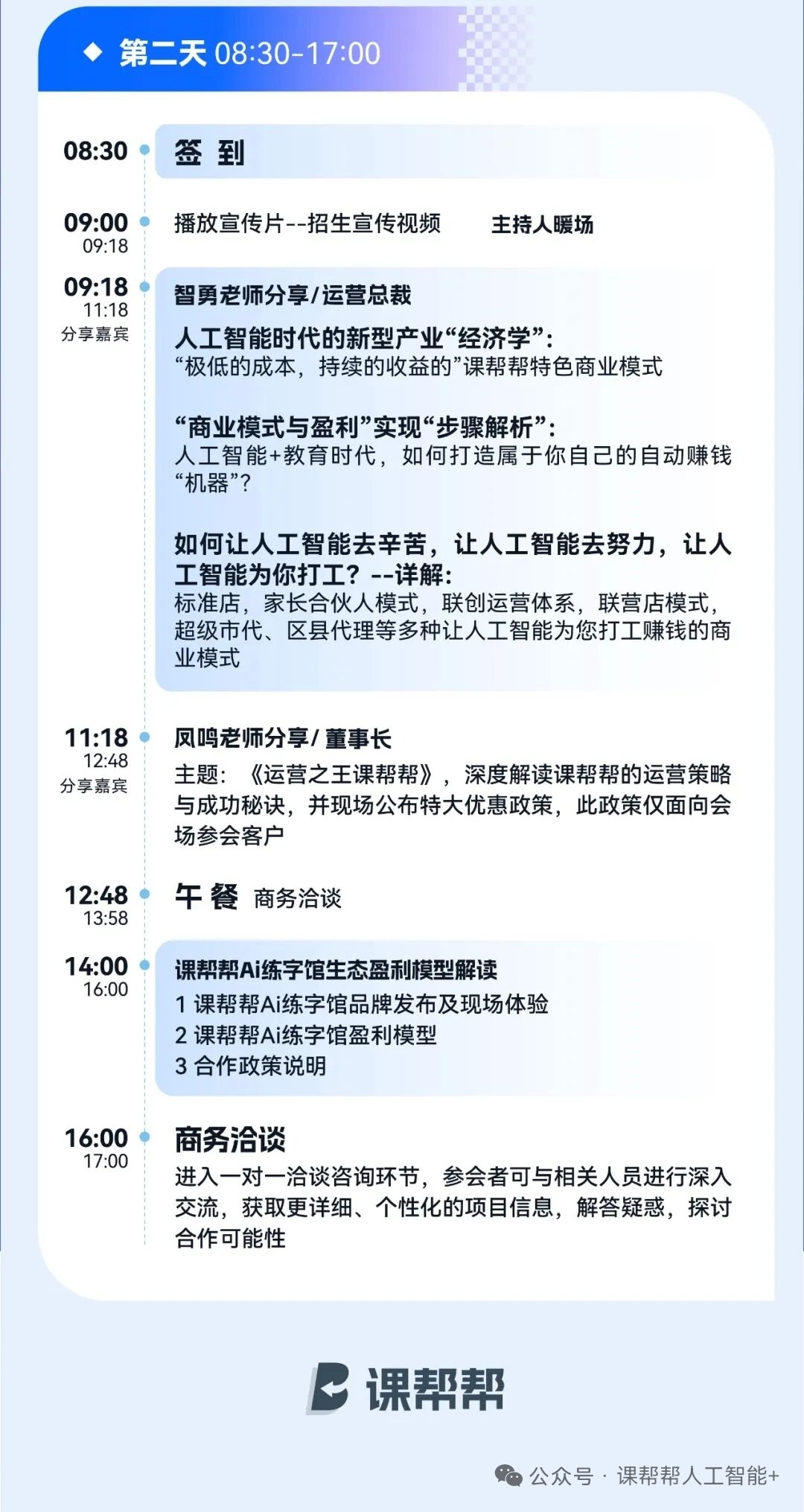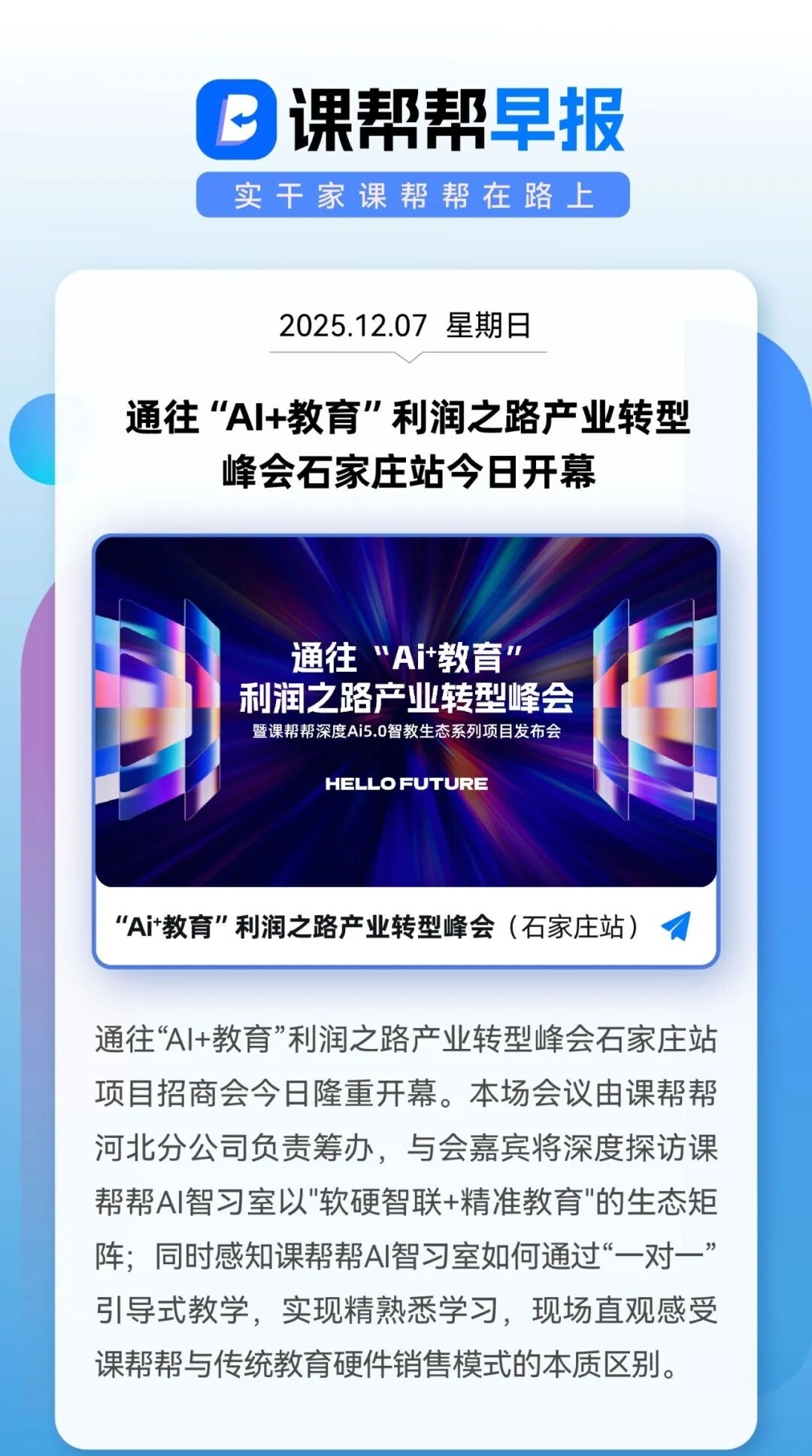 通往"AI+教育"利润之路产业转型峰会石家庄站项目招商会今日隆重开幕。本场会议由课帮帮河北分公司负责筹办,与会嘉宾将深度探访课帮帮AI智习室以"软硬智联+精准教育"的生态矩阵;同时感知课帮帮AI智习室如何通过"一对一"引导式教学,实现精熟悉学习,现场直观感受课帮帮与传统教育硬件销售模式的本质区别。
