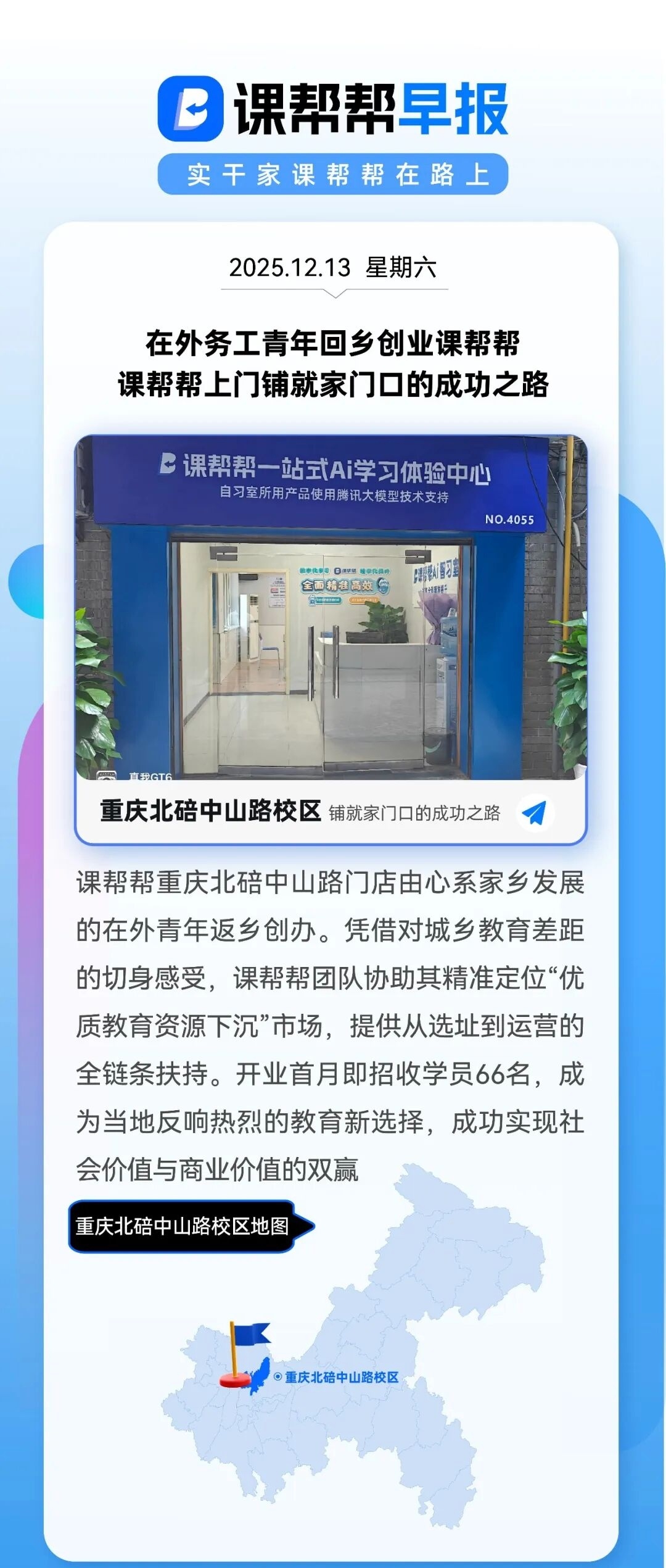 课帮帮重庆北碚中山路门店由心系家乡发展的在外青年返乡创办。凭借对城乡教育差距的切身感受,课帮帮团队协助其精准定位"优质教育资源下沉"市场,提供从选址到运营的全链条扶持。开业首月即招收学员66名,成为当地反响热烈的教育新选择,成功实现社会价值与商业价值的双赢