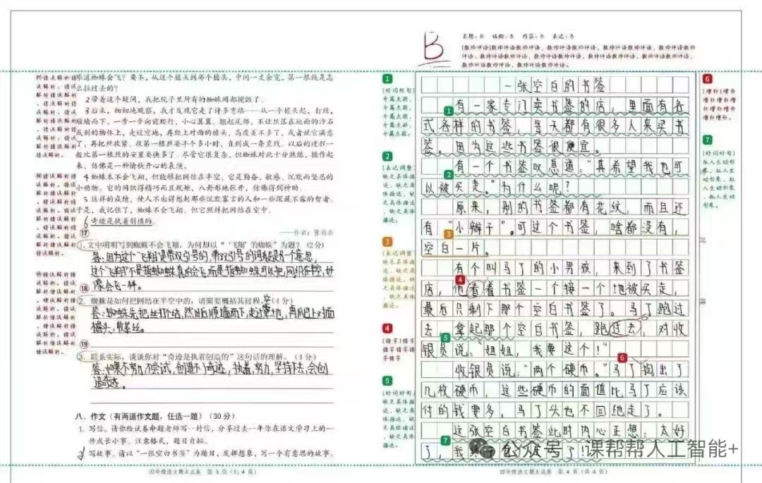 批改语文、英语作文自动生成评语;内置中高考同源技术,实现准确评分、逐句批注点评和润色建议、好词好句划线等功能,结尾还有整体的教师评语和提升建议,帮助学生针对性学习。