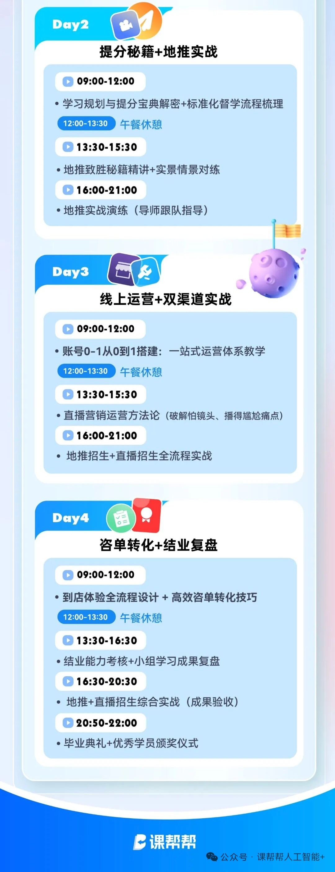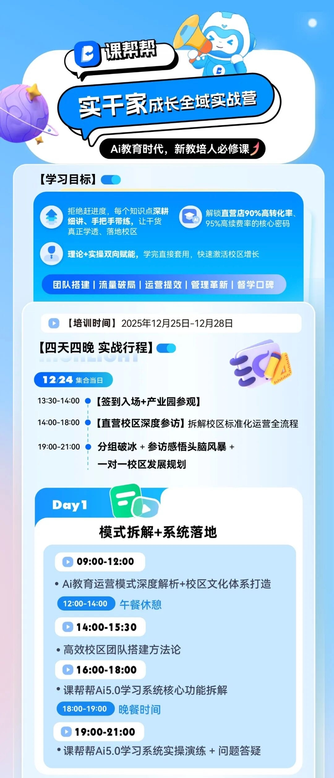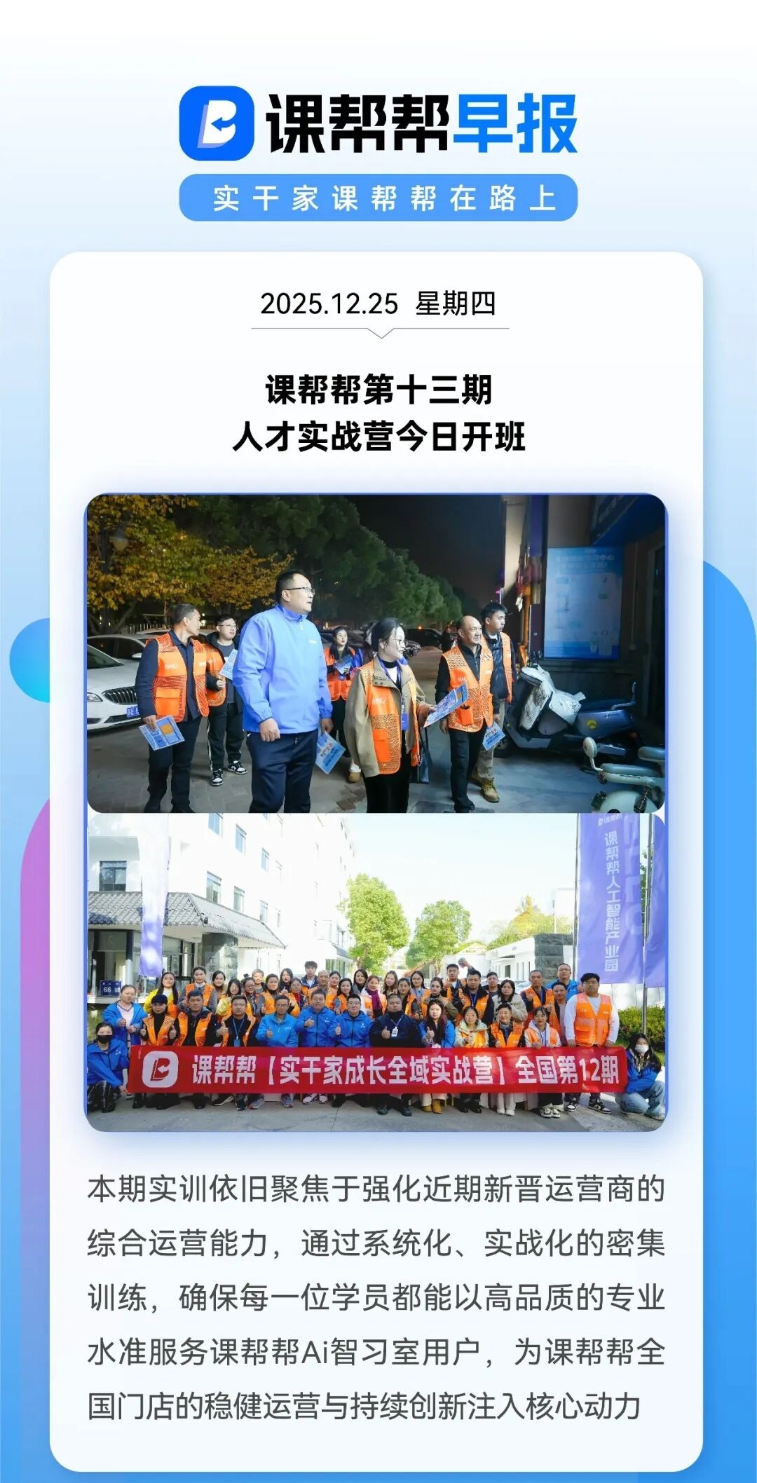 本期实训依旧聚焦于强化近期新晋运营商的综合运营能力,通过系统化,实战化的密集训练,确保每一位学员都能以高品质的专业水准服务课帮帮Ai智习室用户,为课帮帮全国门店的稳健运营与持续创新注入核心动力
