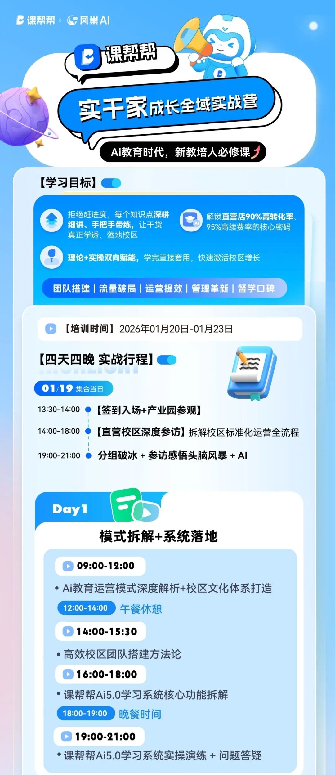 本期实训依旧聚焦于强化近期新晋运营商的综合运营能力,通过系统化,实战化的密集训练,确保每一位学员都能以高品质的专业水准服务课帮帮AI智习室用户,为课帮帮全国门店的稳健运营与持续创新注入核心动力。