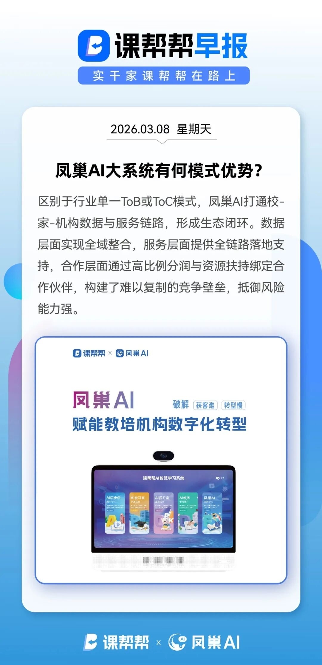 区别于行业单一ToB或ToC模式,凤巢AI打通校-家-机构数据与服务链路,形成生态闭环。数据层面实现全域整合,服务层面提供全链路落地支持,合作层面通过高比例分润与资源扶持绑定合作伙伴,构建了难以复制的竞争壁垒,抵御风险能力强。