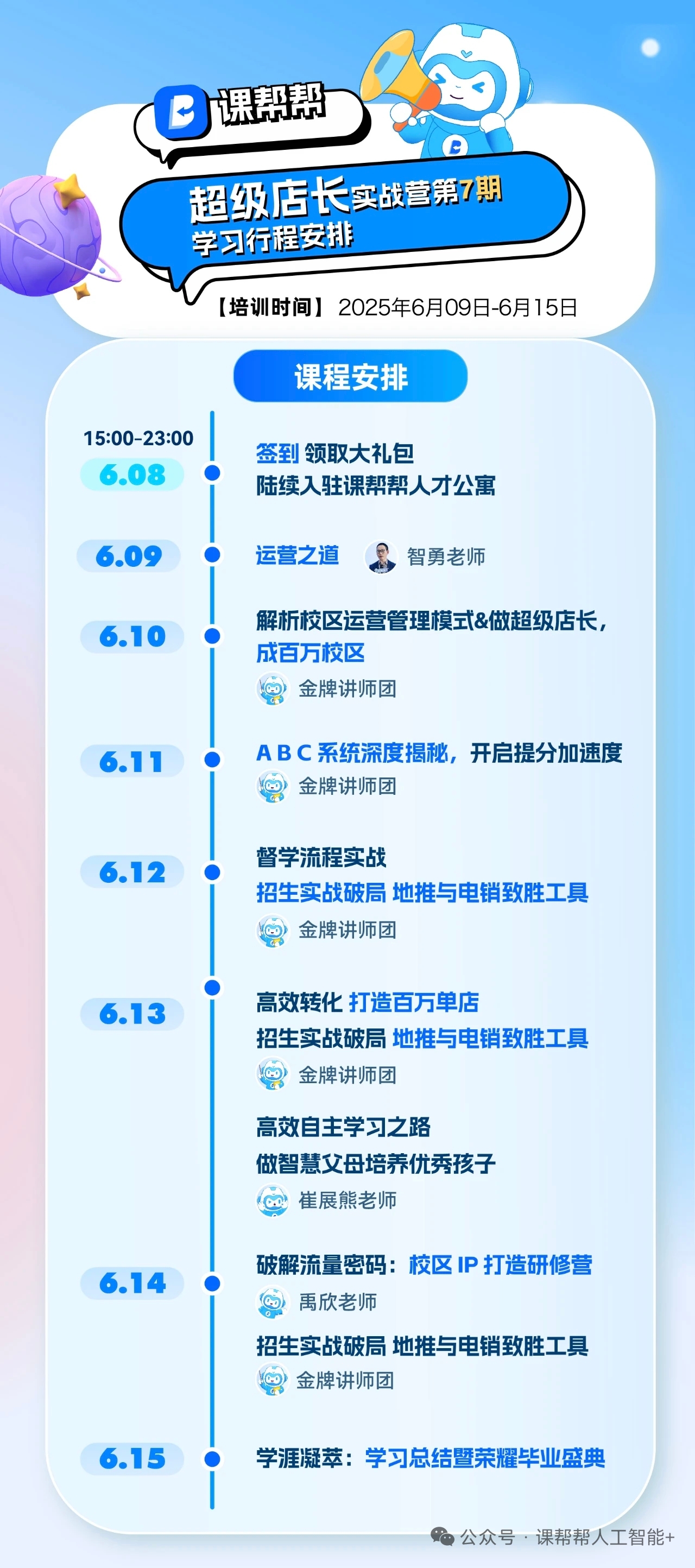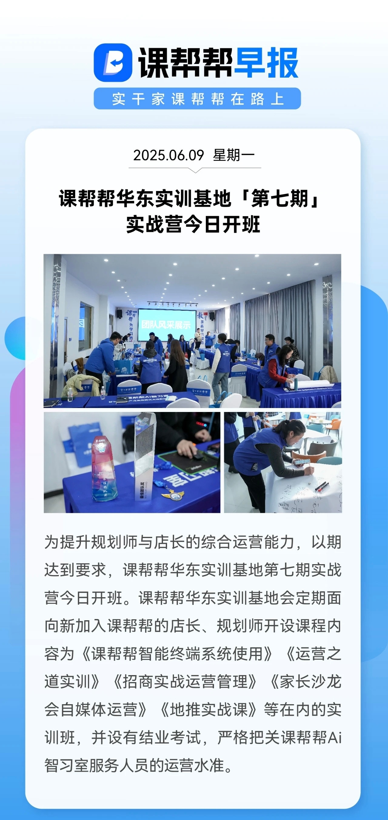 为提升规划师与店长的综合运营能力,以期达到要求,课帮帮华东实训基地第七期实战营今日开班。课帮帮华东实训基地会定期面向新加入课帮帮的店长、规划师开设课程内容为《课帮帮智能终端系统使用》《运营之道实训》《招商实战运营管理》《家长沙龙会自媒体运营》《地推实战课》等在内的实训班,并设有结业考试,严格把关课帮帮Ai智习室服务人员的运营水准。