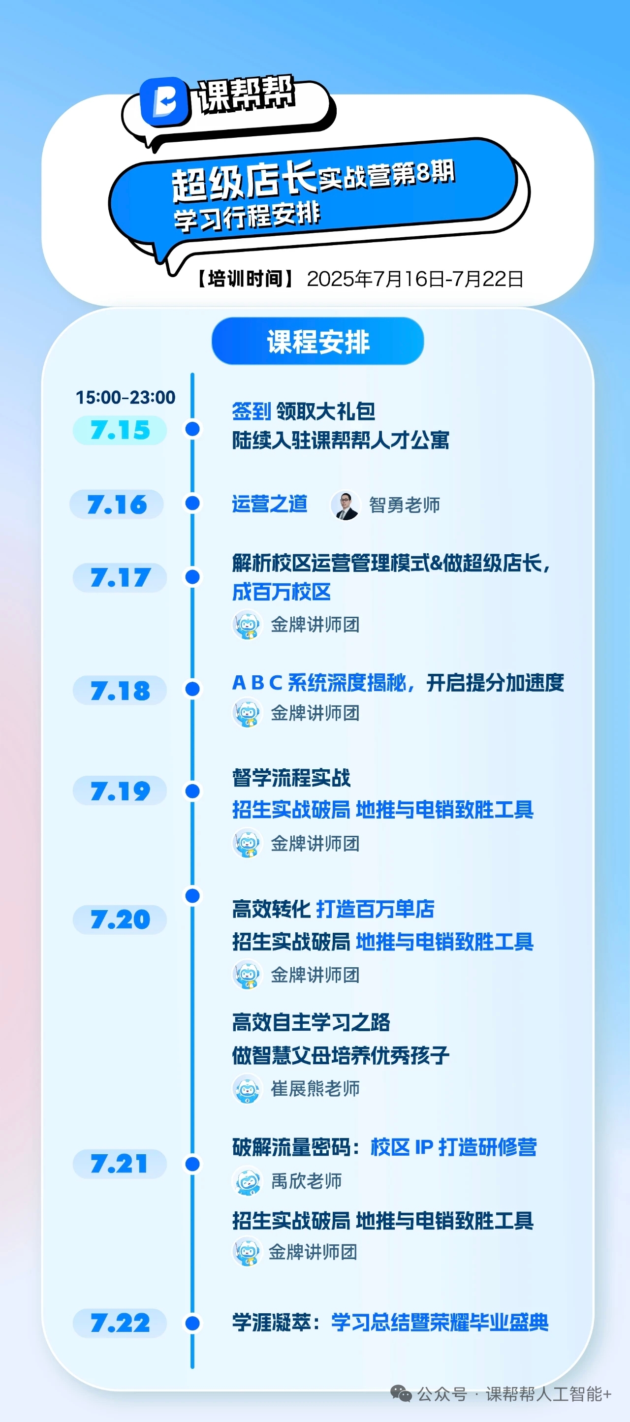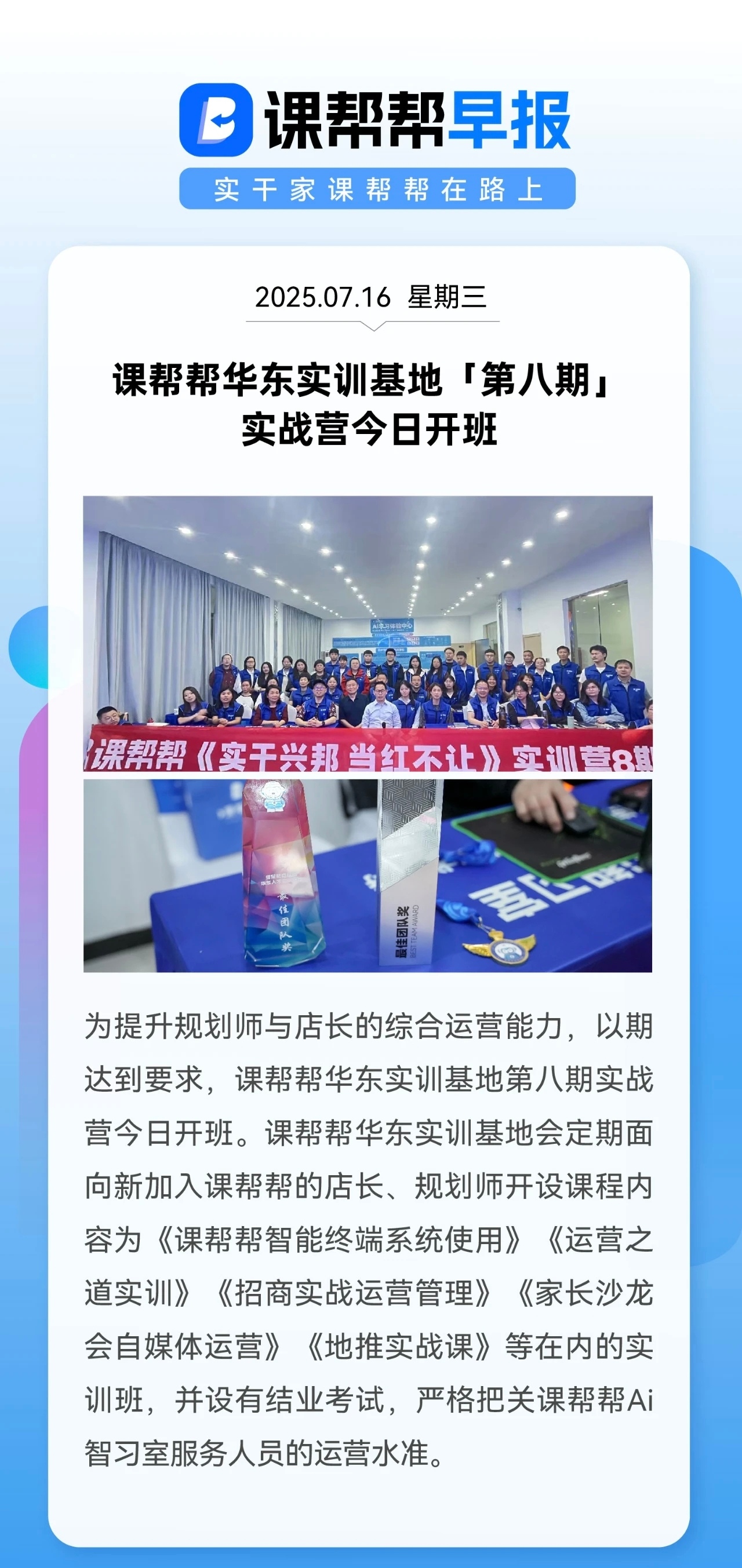 为提升规划师与店长的综合运营能力,以期达到要求,课帮帮华东实训基地第八期实战营今日开班。课帮帮华东实训基地会定期面向新加入课帮帮的店长、规划师开设课程内容为《课帮帮智能终端系统使用》《运营之道实训》《招商实战运营管理》《家长沙龙会自媒体运营》《地推实战课》等在内的实训班,并设有结业考试,严格把关课帮帮Ai智习室服务人员的运营水准。